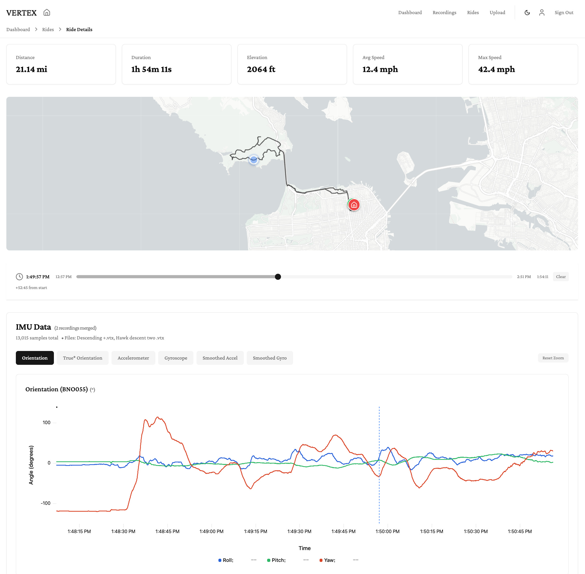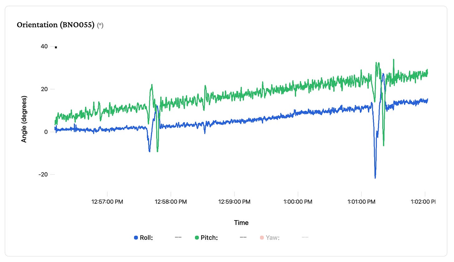 The consumer grade chip I’m using has built in sensor fusion, giving me a calculated “orientation” output that should represent the roll/pitch/yaw of the bike at any given point in time. It looks right initially, it can track turns and leans, however after 10 minutes of flat riding it was telling me the bike was climbing an SF steep street. This chip is designed for smartphones or VR headsets, and I’m asking a lot of it by trying to discern high frequency road noise from steering corrections.