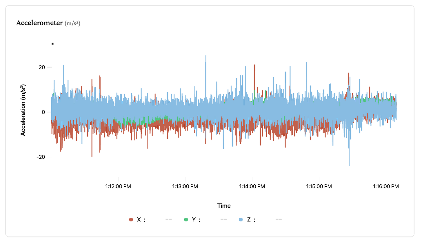 This reality is currently ruining my bike physics modeling project. I have reached the ‘valley of death’ for hardware projects: I can measure everything, but I understand nothing. When I first strapped an IMU (inertial measurement unit) to my bike, the telemetry looked like garbage. The raw acceleration and gyroscope charts looked like fuzzy caterpillars with wild, rapid oscillations on all axes drowning out any visible signal.